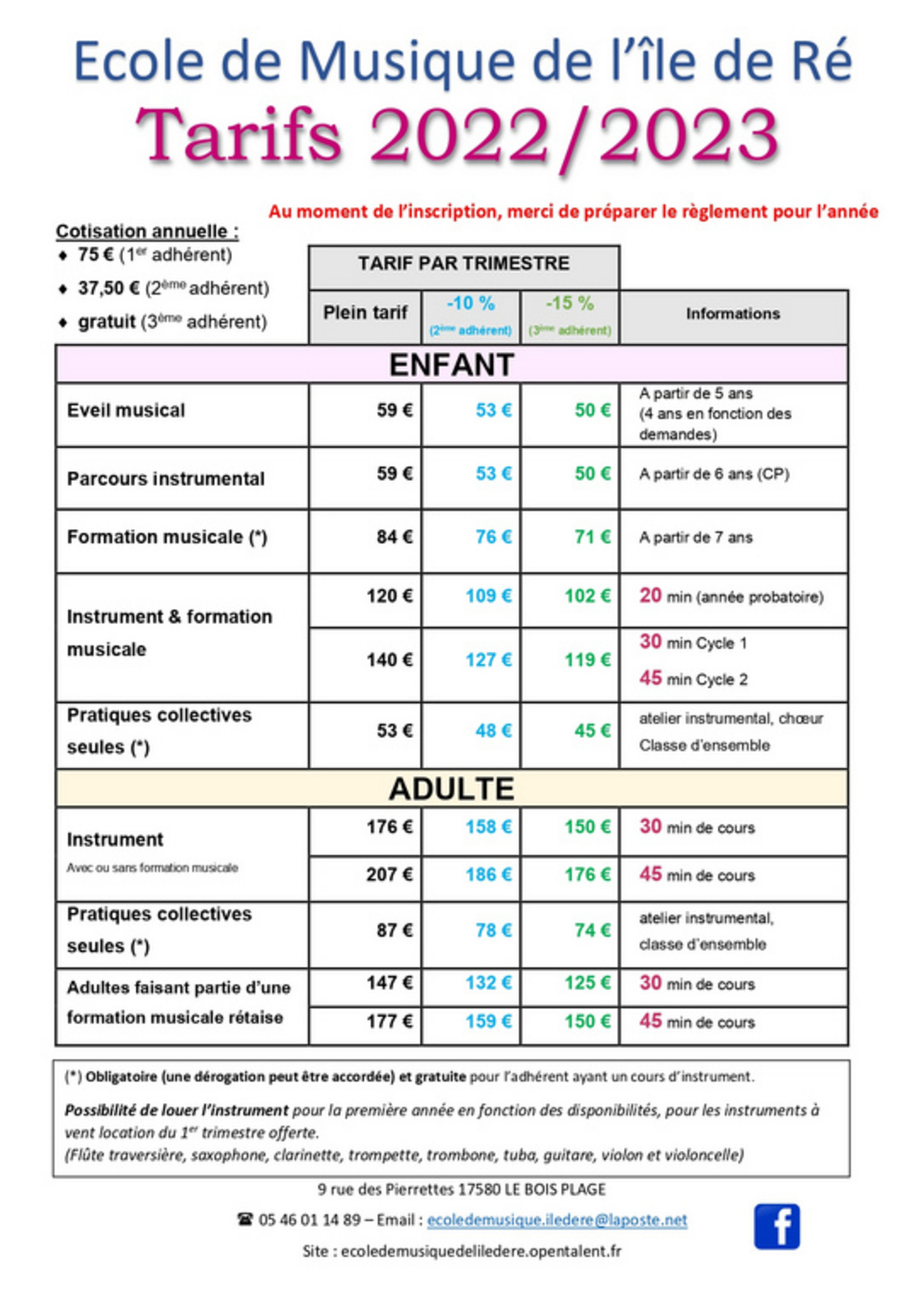 Les adhérents adultes faisant partie d'une formation musicale réthaise (harmonie, fanfare, chorale) bénéficient d'un tarif préférentiel soit: